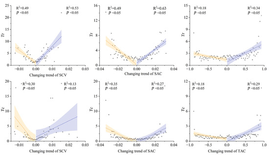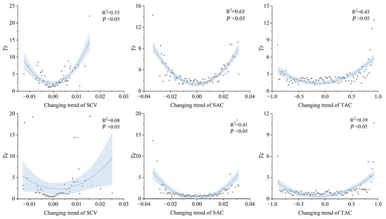 The minimum soil drought thresholds (Tr and Tc) were analyzed against temporal trends of three spatiotemporal heterogeneity indicators (SCV, SAC, TAC) using quadratic curve fitting firstly (Figure 6). Rapidly changed SCV (Tr: >0.005 or <−0.005; Tc: >0.006 or <−0.008), SAC (Tr: >0.02 or <−0.02; Tc: >0.02 or <−0.02), and TAC (Tr: >0.7 or <−0.7; Tc: >0.7) exhibited significantly depressed thresholds, suggesting that accelerated spatiotemporal heterogeneity changes reduce vegetation resistance. All six scenarios showed peak drought thresholds when heterogeneity trends approached zero. However, asymmetric responses emerged that negative heterogeneity trends (slope < 0) reduced drought resistance with different rate compared to equivalent positive trends.