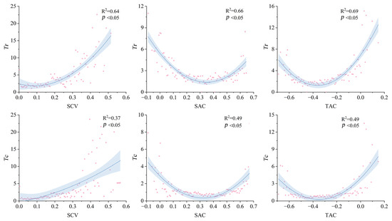 Quadric curve fitting for annual average values of three indicators (spatial variance (SCV), spatial autocorrelation (SAC), and temporal autocorrelation (TAC)) and two soil drought thresholds (Tr and Tc). The shaded areas mean the 95% confidence interval. The unit of Tr and Tc are percentile of soil moisture.