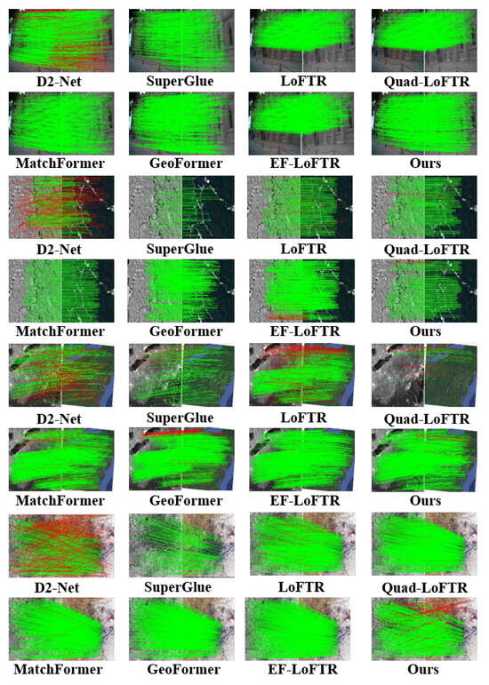 Compared to these methods, our method employs the MTCA, obtaining feature descriptors based on global information from both images, which allows us to find matching points in repeat textures areas. Meanwhile, traditional algorithms often find it challenging to find repeatable points. Additionally, our method establishes QAFF to fuse global context and specify areas of interest, which provides more matching points compared to traditional sparse matching methods like SuperGlue and D2-Net. As shown in Figure 6, Figure 7, Figure 8 and Figure 9, our method exhibits significant robustness in aerial–ground matching and achieves a competitive NCM compared to mainstream methods.