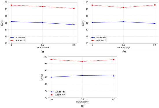 For the choices of hyperparameters α, β, and γ in the loss function of Equation (13), considering computational cost and simplicity, we select all values from the set {1, 0.7, 0.5}. To study the sensitivity of these hyperparameters, we report the OA results against their different values on two tasks, which are shown in Figure 9.