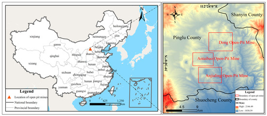 This study focuses on three representative open-pit coal mines within the Pingshuo Mining Area. Located in Shanxi Province, the Pingshuo Mining Area (39°23′N–39°37′N, 112°14′E–112°24′E) is the largest open-pit mining area in China, both in terms of coal mining duration and scale. The mining area extends 23 km from north to south and 22 km from east to west, covering a total area of 444.586 km2, with proven coal reserves of nearly 12.8 billion tons. Situated in the Loess Plateau, the Pingshuo Mining Area features mountainous and hilly terrain, with elevations higher in the northwest and lower in the southeast. Within this area are three large open-pit coal mines: the Dong Open-pit Coal Mine, the Antaibao Open-pit Mine, and the Anjialing Open-pit Mine (Figure 1). These mines are adjacent to each other and share similar climatic and geographical conditions. Table 1 provides a detailed comparison of the characteristics of the three open-pit coal mines.