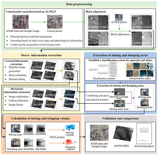 A land surface change volume calculation method based on GF-7 imagery was developed to leverage sub-meter multi-view satellite imagery for extensive, long-term, and multi-angle monitoring of land surface changes. Using a representative open-pit coal mine as a case study, this method was tested and validated, consisting of the following five main components (Figure 3): (1) ACPELP was developed to correct the geometric error of GF-7 imagery (2) Integrated photogrammetry and image processing methods to derive stereo information for two time points of the open-pit coal mines. (3) Established a detailed classification system based on mining functions, which uses elevation and spectral characteristics to distinguish mining and dumping areas, thus excluding non-mining-related changes from affecting volumetric calculations. (4) Designed a method that overlays elevation data with areas of change to calculate the change volume in open-pit mines. By applying a Digital Terrain Model (DTM) approach, the mining and stripping volumes are accurately calculated. (5) The root means square error (RMSE), MAE, maximum error (MAX), and determination coefficient (R2) were used to evaluate the method.