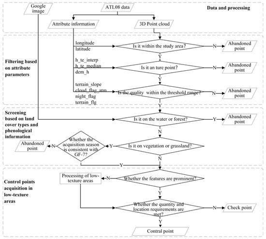Existing extraction methods generally screen control points based on attribute parameters [37], without considering whether the elevation of the object corresponding to the laser point is easy to change and whether the control points are easy to collect. To obtain stable control points, we propose ACPELP for extracting control points from laser altimetry data (ATL08 production), which includes three steps: (1) filtering based on attribute parameters; (2) screening based on land cover types and phenological information; (3) control points acquisition in low-texture areas (Figure 4).