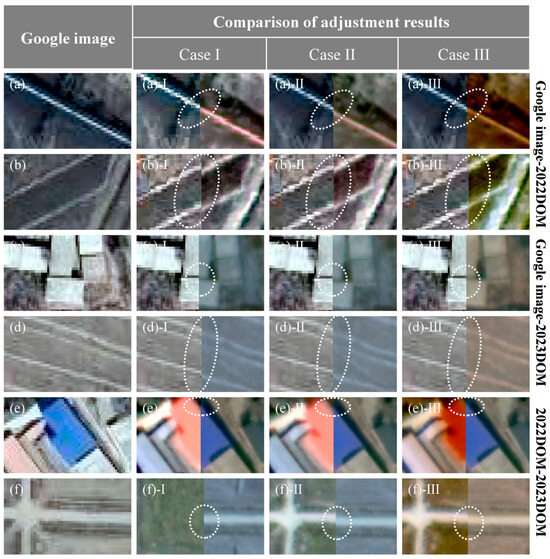 The comparison of the DOM extraction results among the three cases in Section 3.1.3. (a): Google image at transportation pipeline, (a)-I–(a)-III: Geometric accuracy of DOM 2022 compared with Google Imagery in three cases; (b): Google image at farmland, (b)-I–(b)-III: Geometric accuracy of DOM 2022 compared with Google Imagery in three cases; (c): Google image at building, (c)-I–(c)-III: Geometric accuracy of DOM 2023 compared with Google Imagery in three cases; (d): Google image at farmland, (d)-I–(d)-III: Geometric accuracy of DOM 2023 compared with Google Imagery in three cases; (e): Google image at building, (e)-I–(e)-III: Geometric accuracy of DOM 2022 compared to DOM 2023 in three cases; (f): Google image at farmland, (f)-I–(f)-III: Geometric accuracy of DOM 2022 compared to DOM 2023 in three cases.