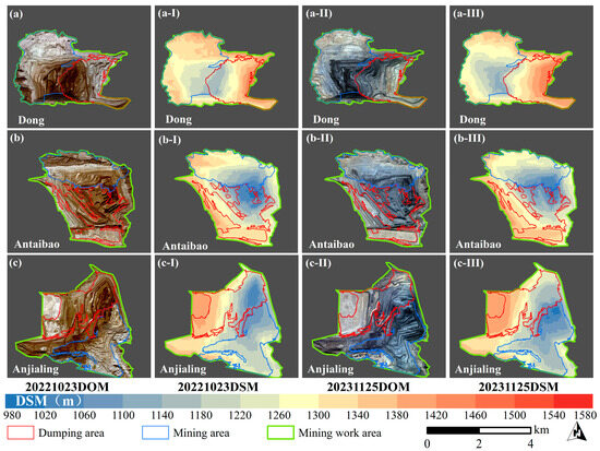 Spectral information and elevation results of three open-pit coal mines, as well as extraction results of mining working area, mining area and dumping area: (a) DOM of Dong on 23 October 2022, (a-I) DSM of Dong on 23 October 2022, (a-II) DOM of Dong on 25 November 2023, (a-III) DSM of Dong on 25 November 2023; (b) DOM of Antaibao on 23 October 2022, (b-I) DSM of Antaibao on 23 October 2022, (b-II) DOM of Antaibao on 25 November 2023, (b-III) DSM of Antaibao on 25 November 2023; (c) DOM of Anjialing on 23 October 2022, (c-I) DSM of Anjialing on 23 October 2022, (c-II) DOM of Anjialing on 25 November 2023, (c-III) DSM of Anjialing on 25 November 2023.