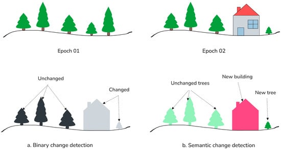 (a,b) Illustrated differences between binary and semantic change. The change results are projected on epoch 02.