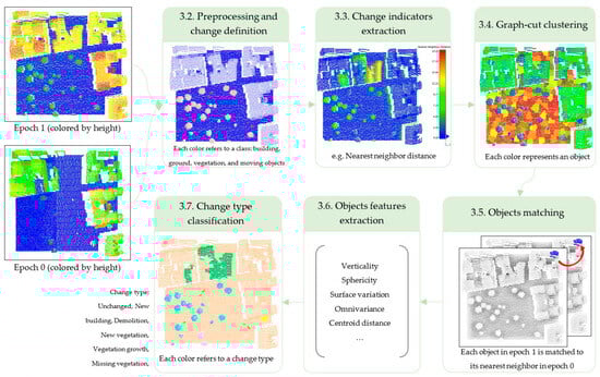 The proposed framework integrates semantic segmentation, geometric change indicators, and object-level analysis to improve the accuracy and consistency of 3D change detection. It follows a structured six-step process. First, preprocessing ensures comparability between bi-temporal point clouds through coordinate alignment, noise filtering, and spatial indexing. If the point clouds are unclassified, semantic segmentation assigns labels to the ground, vegetation, buildings, and moving objects. Second, change indicators are extracted using displacement-based metrics to quantify geometric variations. Third, graph-based clustering segments the point cloud into spatially coherent objects, preserving geometric consistency. Fourth, object matching links corresponding objects across epochs using a nearest-neighbor search based on centroid distance. Fifth, feature extraction combines geometric descriptors (e.g., verticality, sphericity, omnivariance, and surface variation) with semantic information to characterize object-level changes. Finally, a random forest classifier assigns change labels, distinguishing the different types of modifications. Figure 2 summarizes the workflow of the proposed framework.