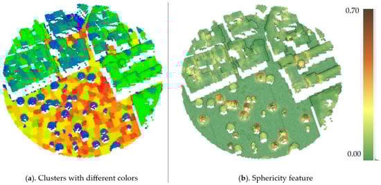 Illustration of cut-pursuit clustering and sphericity feature results. (a) shows results of cut-pursuit clustering, where each color represents a distinct object. (b) shows an example of a geometric feature, sphericity, calculated at a 6 m diameter. The color scale ranges from dark brown (high sphericity values) to green (low sphericity), indicating how well the neighbors fit a spherical shape.