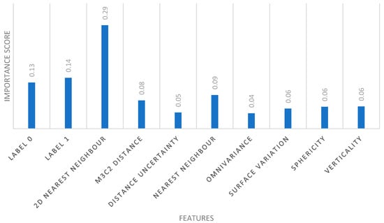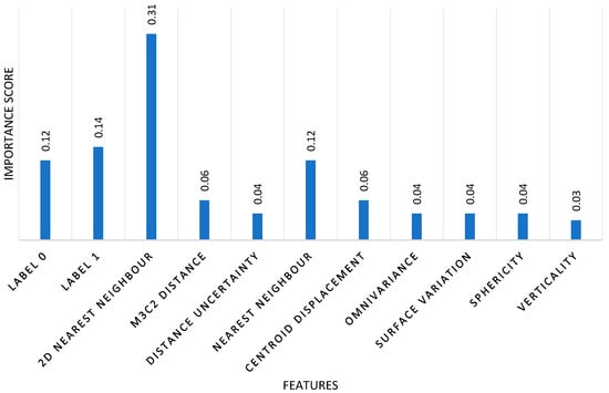 A key advantage of our method is its computational efficiency. By operating at the object level rather than the point level, the method significantly reduces the number of elements processed, leading to faster training and inference times (it was six times faster than point-based methods). In terms of interpretability, in Figure 7, we present the feature importance analysis that highlights the key features contributing to change type classification. The x-axis represents the different features analyzed, while the y-axis represents the importance of each feature. The units on the vertical axis are dimensionless and represent the relative importance of each feature, normalized to a range between 0 and 1, where 1 indicates the most important feature. This normalization allows for a clear comparison of the contribution of each feature to the classification performance. The 2D nearest-neighbor distance holds the highest importance (0.31), indicating that spatial proximity within the horizontal plane is a crucial factor for distinguishing changes. The semantic labels (label 0 and label 1) also play a significant role (0.12 and 0.14, respectively), emphasizing the relevance of object class consistency across epochs. The M3C2 distance (0.06) and object’s centroid displacement (0.06) provide valuable insights into geometric changes, particularly for structural modifications. Distance uncertainty (0.04), omnivariance (0.04), surface variation (0.04), and sphericity (0.04) contribute moderately, while verticality (0.03) holds the lowest importance, suggesting that vertical alignment is less discriminative for identifying changes in this dataset.