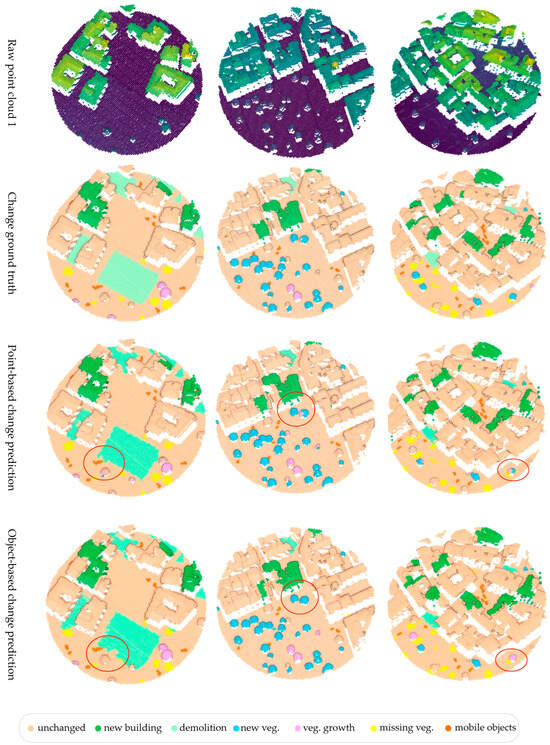 The qualitative evaluation compares the predictions of the object-based and point-based methods with the ground truth (Figure 9). The point-based approach captures detailed changes with high precision but introduces noise (red circles), as small variations are sometimes misclassified as a change. A main limitation appears in vegetation growth detection, where part of the tree is classified as unchanged, while new points are labeled as growth. This leads to errors in identifying gradual expansion.