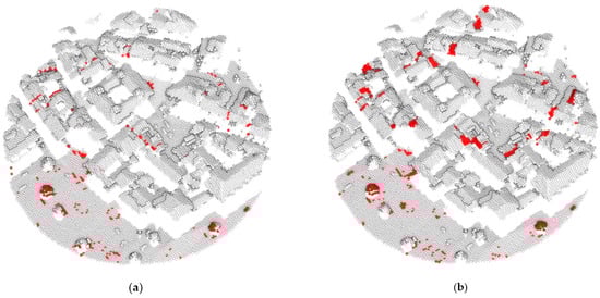 The proposed method was implemented using the predefined point cloud classification, with all the data already registered. Feature extraction was performed using a 6 m diameter for computing geometric features such as verticality, sphericity, surface variation, and omnivariance to ensure robust local shape characterization. Change indicators were derived using C2C distances computed with a nearest-neighbor search, as well as M3C2 distances with a normal diameter of 14 m, a projection diameter of 14 m, and a maximum depth of 50 m to capture variations at multiple scales, particularly for complex urban structures and vegetation (see Figure 6b).