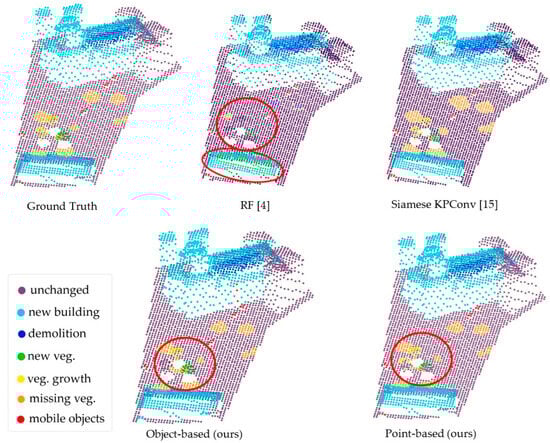 The object-based method provides more stable results with reduced noise due to structured segmentation. However, clustering influences the shape of the predicted changes, especially at object boundaries. When clusters do not match the exact shape of the change, the detection follows the cluster limits rather than the actual change boundary. This effect is noticeable along the edges of buildings and trees, where the segmentation structure affects classification. Figure 10 presents the committed errors of both methods, showing the differences in how each approach handles change detection. The results shown in Figure 11 illustrate the qualitative results achieved. The RF-based method was the least effective, where we can clearly see problems in the buildings, and the disappeared vegetation. It detects a new building as vegetation, which can be explained by the geometric similarity of these two objects in the dataset. Siamese KPConv, on the other hand, performed the most and gave visually more consistent results. In contrast, our two methods are positioned between traditional and more advanced approaches, with the object-based showing consistent results.