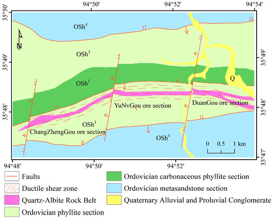 The Tuolugou mining area is located within the East Kunlun orogenic belt, specifically in the active zone of the southern Kunlun continental margin. As shown in Figure 1, the exposed strata in the area primarily consist of three lithological sections from the Ordovician Nachitai Group: the carbonaceous phyllite (OSh2), the phyllite (OSh3), and the metasandstone (OSh4). OSh2 is mainly composed of carbonaceous phyllite, carbonaceous slate interbedded with siltstone, and thin-layered limestone. OSh3 is chiefly composed of chlorite–sericite–quartz schist, quartz–albite rock, and sericite-quartz schist. OSh4 mainly consists of metasandstone, metaconglomerate, quartz–albite rock, chlorite–sericite–quartz schist, and siliceous rock [27]. In addition to these three lithological sections, a Co (Au)-bearing quartz–albite belt and Quaternary sediments have developed in the Tuolugou area.