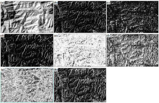 Texture feature images: (a) mean; (b) variance; (c) second moment; (d) contrast; (e) entropy; (f) homogeneity; (g) correlation; and (h) dissimilarity.