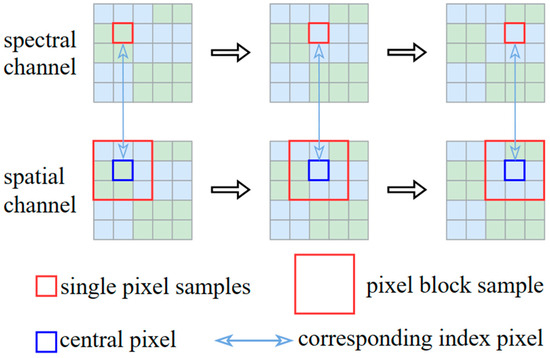After data preprocessing, the GF5B hyperspectral image and multitemporal Landsat-8 images were both adjusted to a size of 595 × 359 pixels, with a spatial resolution unified to 15 m, covering an area of approximately 48 km2. The GF5B hyperspectral image comprises 293 bands, constituting the spectral features, whereas the spatial feature extracted from the multitemporal Landsat-8 image contains 12 bands. A schematic illustrating the sample generation process is presented in Figure 4.