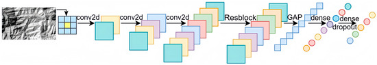 The 2D-CNN can analyze the neighboring features of the pixel blocks, thereby extracting spatial information from the image. The structural parameters of the spatial feature channel are listed in Table 5, with a schematic diagram shown in Figure 6. The spatial feature channel consists of three two-dimensional convolutional layers, a residual block, a global average pooling layer, and two fully connected layers. The channel receives a 5 × 5 pixel block constructed around a single pixel at the center. First, two-dimensional convolutional layers are used to extract 12 spatial features from each pixel block; these are followed by an additional convolutional layer to capture the more complex features. Generally, the deeper the network is, the stronger its ability to extract feature information. However, simply increasing the network’s depth may lead to issues such as gradient vanishing and network degradation [67]. Therefore, a residual block is added after the three convolutional layers. The residual network (ResNet) uses skip connections to map shallow features. Without any additional parameters or increased computational complexity, this architecture addresses the issues of gradient vanishing and network degradation caused by deeper networks [68]. Second, the output features of the residual block are reduced to a one-dimensional vector through a global average pooling layer. Third, the dimension-reduced features are fed into two fully connected layers in which the dropout technique is applied to reduce overfitting and enhance model generalization. Finally, a fully connected layer containing 128 neurons is used to compress and integrate the feature information, and the resulting output serves as the final representation of the spatial feature channel.