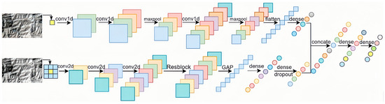 In this model, the spectral feature channel uses a one-dimensional convolutional neural network (1D-CNN) in which the input and output data are two-dimensional, and the kernel slides along one direction. In hyperspectral image classification, since the spectral information is one-dimensional, a 1D-CNN is commonly used for extracting spectral information [53]. The spatial feature channel uses a two-dimensional convolutional neural network (2D-CNN). The 2D-CNN captures spatial information through two-dimensional convolutions, and has been widely used for hyperspectral image classification, achieving good classification accuracy [54,55]. The features output from the two channels are subsequently concatenated into a combined feature vector that contains spectral and spatial information, thus implementing lithology identification through feature fusion. The detailed structure of the model is introduced in Section 4.2.
