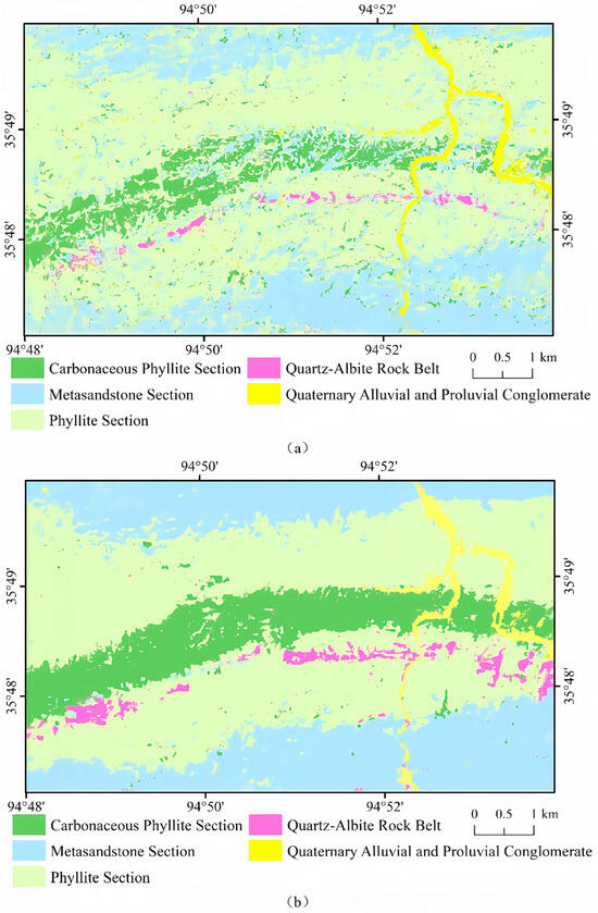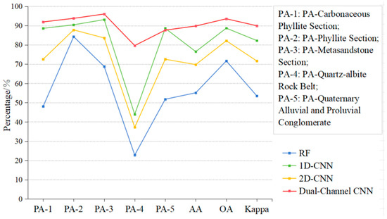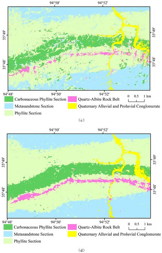 Figure 8 shows the lithology identification results generated by the four models. The RF model exhibits the poorest performance, particularly in the identification of the carbonaceous phyllite section and quartz–albite, leading to significant misclassification issues. It identifies only a small portion of the pixels correctly, resulting in an overall accuracy that is significantly lower than those of the other models (Figure 8a). The 1D-CNN model can effectively distinguish different lithologies overall, however, its accuracy is relatively low in local areas, resulting in confusion between the carbonaceous phyllite section and the phyllite section (Figure 8b). In the prediction results of the 2D-CNN model, the misclassification of pixels among the carbonaceous phyllite section, phyllite section, and metasandstone section becomes more pronounced, and the 2D-CNN struggles to distinguish the boundary between the phyllite section and metasandstone section (Figure 8c). The DC-CNN model accurately identifies five lithological units, with clear lithological boundaries in the predicted results and relatively few misclassified pixels within each unit (Figure 8d). Additionally, both the 1D-CNN and 2D-CNN models have difficulty accurately identifying quartz–albite, whereas the DC-CNN model effectively recognizes most of the quartz–albite. This further demonstrates that the dual-channel network structure, which can extract the spectral and spatial features separately, has significant advantages over single-channel networks. Compared with those of the other three models, the classification results of the DC-CNN model are very close to the actual geological map, especially in classifying the quartz–albite rock belt. Thus, the DC-CNN model has the best performance in lithology identification for the Tuolugou mining area.