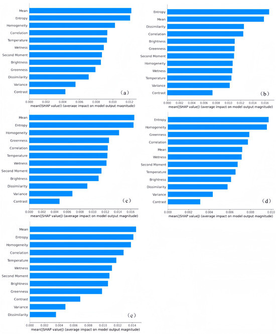 SHAP feature-importance charts: (a) metasandstone section; (b) quaternary alluvial and proluvial conglomerate; (c) phyllite section; (d) carbonaceous phyllite section; and (e) quartz–albite rock belt.