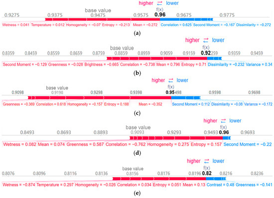 Average SHAP force plots: (a) metasandstone section; (b) quaternary alluvial and proluvial conglomerate; (c) phyllite section; (d) carbonaceous phyllite section; and (e) quartz–albite rock belt.