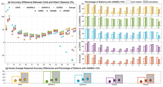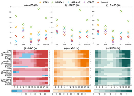 - Normalized Root Mean Square Deviation, nRMSD:where is the number of hourly samples, is the mean hourly SSR from the reference surface observations, is the hourly SSR estimated from the validated products, and is the reference hourly SSR observed at surface stations.