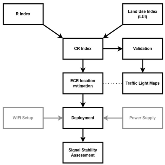 General workflow of this study. Processing of the CR Index in order to find suitable locations for ECRs and their following deployment and stability assessment.