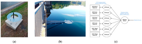 Setting up the ECR installation. (a) Mounting the support structure for an embankment dam and (b) a gravity dam. (c) Installing LTE routers with a VPN tunnel.