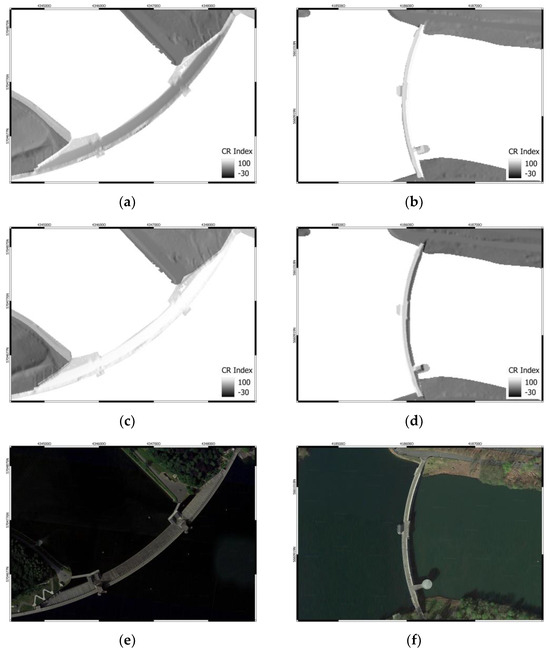 CR Index for the two gravity dams (Möhne and Lister) for ascending and descending directions, respectively. Darker values indicate a lower CR Index while brighter values indicate a higher CR Index. Satellite images (Esri satellite) for visual comparison. (a) Möhne, ascending; (b) Lister, ascending; (c) Möhne, descending; (d) Lister, descending; (e) Möhne, satellite; (f) Lister, satellite.