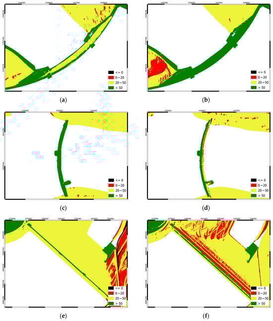 Roads generally reflect radar signals away from the sensor, reducing their suitability for PSI analysis. However, objects like streetlights or guardrails in road areas often generate PS points, warranting an LUI of 25 rather than 0, which was calculated in [51]. Conversely, dams classified as “structures in water areas” require further adjustments due to their vegetation cover, which reduces PSI applicability compared to concrete or stone surfaces.