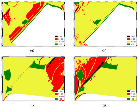 Classification of the CR Index into three classes (traffic light map). Shown are all five dam structures in ascending and descending directions, respectively. (a) Möhne, ascending; (b) Möhne, descending; (c) Lister, ascending; (d) Lister, descending; (e) Sorpe, ascending; (f) Sorpe, descending; (g) Bigge, ascending; (h) Bigge, descending; (i) Verse, ascending; (j) Verse, descending.
