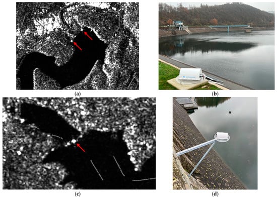 Installed ECRs: (a) signals of ECRs at Bigge dam in SAR image; (b) installed ECR at Bigge dam; (c) signal of ECR at Möhne dam in SAR image; (d) installed ECR at Möhne dam. The installations at the other dams were carried out in a similar manner.