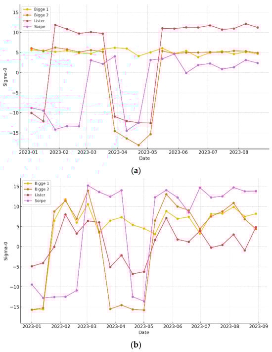 In contrast, Sorpe performs the poorest among the reflectors in ascending mode, with the lowest mean Sigma-0 value of 2.48 dB and the highest variability, as indicated by a standard deviation of 1.30. These metrics highlight significant inconsistencies in Sorpe’s signal behavior. In the descending mode, the reflectors display more variability compared to the ascending observations. Bigge 2 emerges as a strong performer, with a mean Sigma-0 of 8.42 dB. However, this is accompanied by a high standard deviation of 3.09, indicating considerable variability in signal stability. Sorpe, while achieving the highest mean Sigma-0 of 13.16 dB in descending mode, also demonstrates a broad range of values, pointing to potential instability under certain conditions. Lister, on the other hand, performs the weakest in descending mode, with a mean Sigma-0 of only 3.11 dB and the highest standard deviation of 2.87. This highlights substantial challenges in maintaining consistent backscatter signals at Lister in descending observations, which are likely influenced by local site conditions or orientation factors.