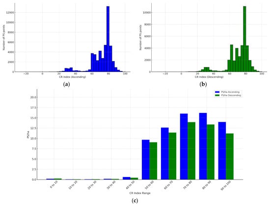 Histograms of PS points for different CR index value ranges. (a) Ascending; (b) descending; (c) density of PS points in PS per hectare for different CR index value ranges.