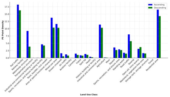 The comparison of PS point density across land use classes adds another layer of validation for the CR Index. It is shown for all land use classes in Figure 11. Urban and built-up areas, such as residential zones, industrial regions, and transportation infrastructure, exhibit the highest PS densities. This finding aligns with the high CR Index values typically associated with these areas, as they are rich in artificial structures that serve as stable scatterers for radar signals. For example, residential areas show consistently high PS densities, making them ideal targets for PSI-based monitoring. In contrast, vegetated and water-dominated areas, such as forests, swamps, and moors, demonstrate significantly lower PS densities. These land use types are characterized by dynamic surface properties (e.g., vegetation movement, water absorption), which reduce their suitability for PSI and result in correspondingly low CR Index values. Mixed-use areas and regions with special functional characteristics show moderate PS densities, reflecting their diverse surface compositions and variable potential for radar backscatter.