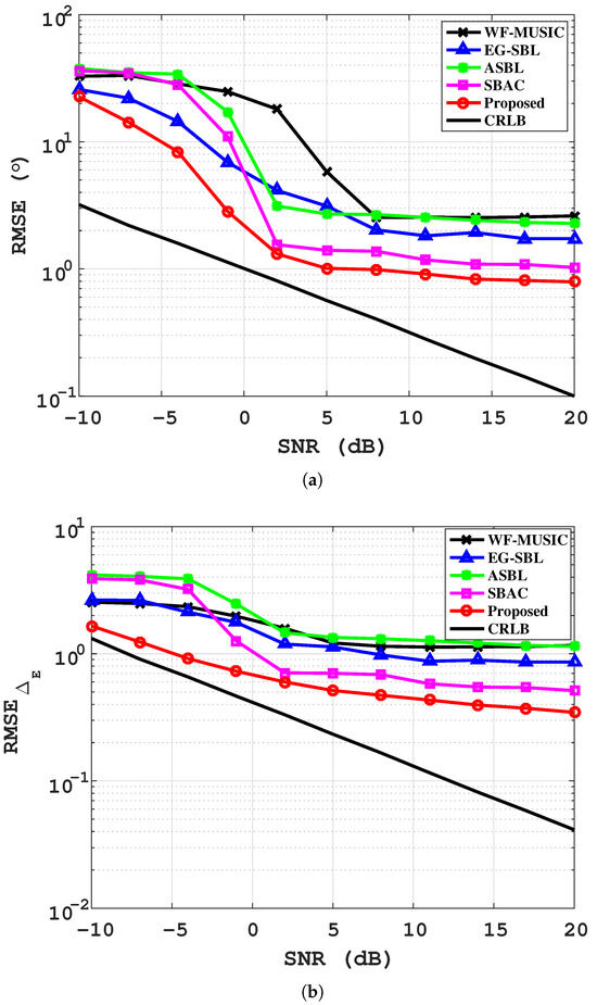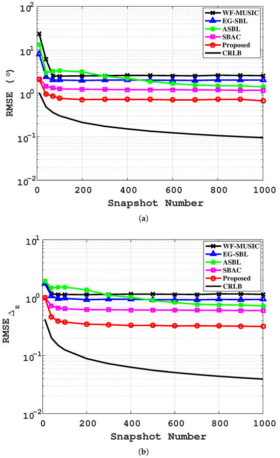 The SNR is fixed at 5 dB, and the number of receiving snapshots is increased from 10 to 1000. The RMSE comparison curves under different snapshot numbers are presented in Figure 4a,b. It can be observed that the WF-MUSIC and EG-SBL methods have a higher demand for the number of snapshots, leading to poor performance at small snapshots (). All algorithms perform smoothly as the number of snapshots increases. The SBAC and the proposed method can achieve stable and high-precision DOA estimation and gain-phase calibration with fewer snapshot numbers. This advantage is of great significance for increasing the realizability of engineering applications.