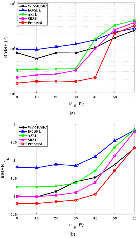 From Figure 7, we can observe that both the WF-MUSIC and EG-SBL methods are calibrated based on the feature structure, which requires a high number of snapshots and performs poorly in this condition. The ASBL and SBAC methods can calibrate the amplitude-phase deviation and obtain bearing estimation results more stably when the phase perturbation standard deviation is less than . However, when the phase perturbation standard deviation is more than , the performance of the two methods degrades seriously, and the deviation of the RMSE of the target bearing is more than , which implies that the methods are invalid. Compared with other methods, the proposed method has better DOA estimation accuracy and amplitude-phase deviation estimation accuracy, and the standard deviation of phase disturbance tolerance is . When the standard deviation of the phase disturbance is less than , the estimated deviation of the target orientation is less than , which indicates that the proposed method has better tolerance of phase deviation than other comparison methods.