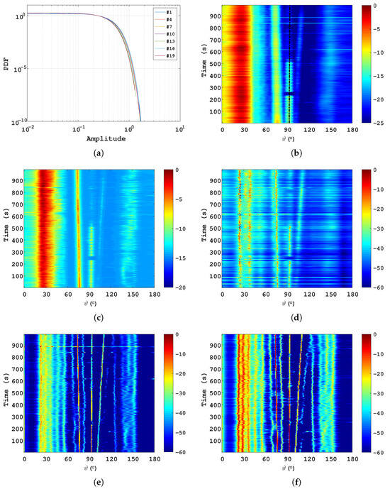 The statistical characteristics of the received signal and the BTMs of the different algorithms, where and . (a) The statistical characteristics of the received signal; (b) BTM of CBF algorithm; (c) BTM of WF-MUSIC algorithm; (d) BTM of ASBL algorithm; (e) BTM of SBAC algorithm; (f) BTM of proposed algorithm.