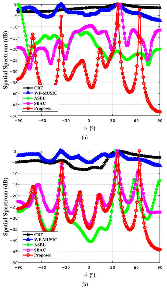 The spatial spectrum of the proposed method and the compared methods in different circumstances, where SNR = 5 dB, and . (a) Array condition is perfect; (b) Array has gain and phase deviations and exists in non-uniform noise environments.