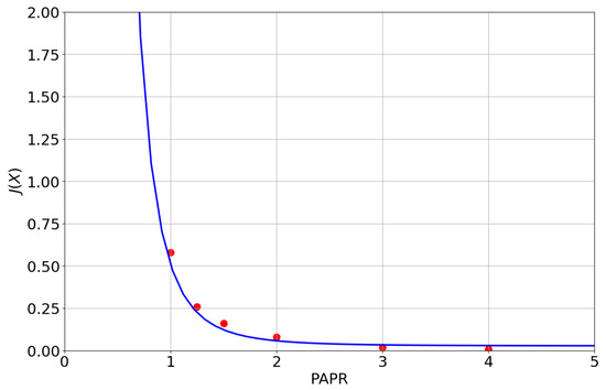 From Equation (9), illustrated in Figure 2, we can conclude that minimizing the distance of both high-order moments of the generated waveform to the Gaussian ones minimizes negentropy. Furthermore, as illustrated by the red points in Figure 2, we add the simulation results obtained in [16] for an estimation of negentropy using the histogram approximation of the PDF of a single noise waveform with a uniform spectrum, bandwidth, and variance. Consequently, we validate our theoretical expression and conclude that Equation (9) accurately fits the waveforms in [16] for fixed values of high-order moments of X: , , and . Note that PAPR cannot define a function of X alone; for each case, it is necessary to estimate the distinct parameters represented in Equation (9). Furthermore, note that the approximation in Equation (7) suffers from non-robustness due to the need to estimate kurtosis. Therefore, the approximation in Equation (9) is more accurate for kurtosis values close to 3. Moreover, it is important to keep in mind that generating noise signals by designing a random phase and implementing a complex exponential is different that generating iid I and Q components. The kurtosis of the complex exponential is close to 0, since it maps a real Gaussian distributed sequence to a non-Gaussian distribution in the complex plane. Moreover, it is important to keep in mind that generating noise signals by designing a random phase and applying a complex exponential is different from generating iid I and Q components. The resulting complex exponential signal has a non-Gaussian distribution with a constant amplitude and a uniformly distributed phase, unlike a Gaussian distribution in the complex plane produced by iid I and Q components.