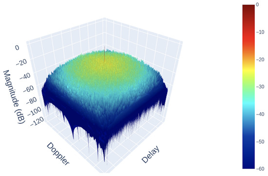 To better understand how the AF is impacted by implementing deterministic sequences, Figure 3 shows the plot for a frequency modulated signal, while Figure 4 showcases the AF of Gaussian-distributed noise.