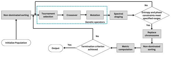 The SS-NSGA maintains a population of candidate solutions represented as individuals. It implements a non-dominated sorting technique to rank individuals based on their Pareto dominance relationship, where one solution is better if it has at least one objective better than another solution, and all the others are not worse. To maintain diversity within each Pareto front, it calculates the crowding distance for each solution, which is a measure of the average distance between the solution itself and its neighbors in the objective space. Then, it implements elitist selection, crossover, and mutation operations to enhance diversity and convergence of solutions over each generation. Thereafter, the resulting waveform sequences are shaped in the Fourier domain with a Taylor window, while constraining the result vector to the phase of the complex exponential waveform and negentropy values represented in Equation (17). The algorithm continues until a termination criterion is met, such as achieving a desired objective value or reaching a specified number of generations. Figure 5 shows a summarized flowchart of SS-NSGA.