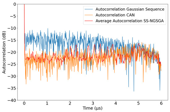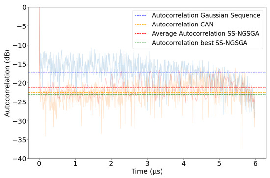 Average ACF sidelobes of Gaussian noise, CAN algorithm, our method’s average and best solution in blue, orange, red, and green, respectively.