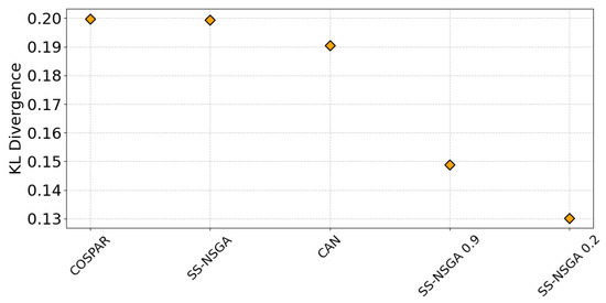 To demonstrate this claim, we make a comparison of the time–frequency representations of COSPAR, CAN and our method to the representation of a Gaussian sequence. For each method, the ambiguity function plot of the optimized sequence is computed, converted to grayscale, resized, and normalized. Then, the Kullback–Leibler divergence is calculated as in Equation (4), where the PDF represented by and , are now matrices expressing the normalized grayscale pixels of the image of the evaluated method and the Gaussian sequence, respectively. Observe that zero KLD indicates that the signal is identical to the Gaussian reference time–frequency image, whereas greater values suggest a more distant representation from the reference one.