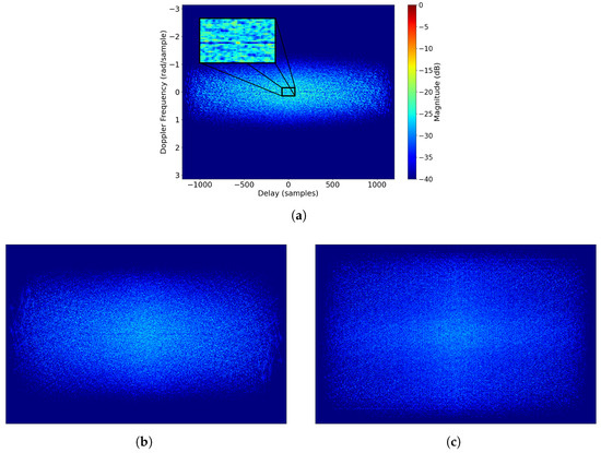 To better understand how the sidelobes and AF are impacted by constraining the waveform to a certain , Figure 11a displays the AF for an optimized waveform without any constraint and the AF for and in Figure 11b,c, respectively. We see that the more we constrain the optimization problem, the more the shape of the AF gets closer to that of a Gaussian random sequence. Hence, besides achieving good performance for solving the stand-alone MOP, we derived a solution for shaping the AF, that can be applied to various situations and be an object for studying NRT radar recognition and performance of ESM systems.
