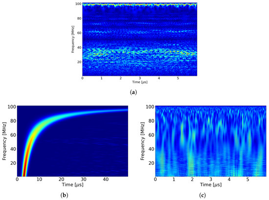 In the CWT analysis, we use the Morlet wavelet [32], which is a widely used continuous wavelets in time–frequency analysis that provides a good compromise between time and frequency resolution. The CWT of Gaussian noise is displayed in Figure 13c. We observe that our waveform, similarly to the STFT analysis, is spread across the time–frequency plane. However, it has a cluster of energy over the high-frequency components. This may be an object of study in future work, whether we can implement time–frequency analysis to detect these waveforms or not. Also, by constraining the MOP, we can change the CWT of the signal pattern close to that of Figure 13c.