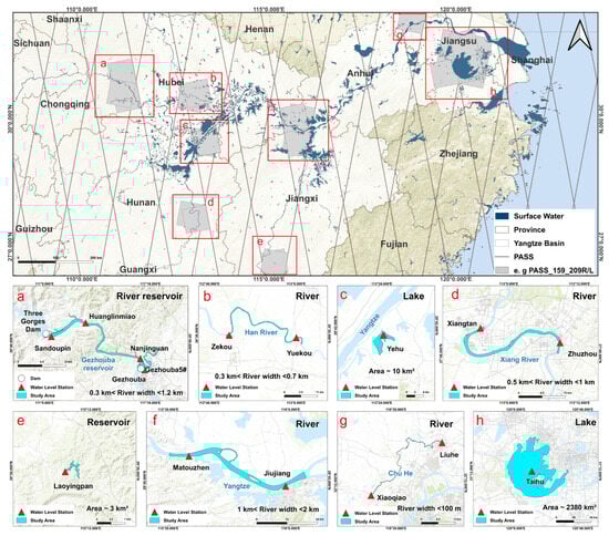 The spatial distribution of study areas and related characteristics in the middle and lower reaches of the Yangtze River. The gray shaded regions indicate the coverage areas of SWOT satellite passes over the study region, and the red rectangles delineate the locations of the selected study areas. (a–h) encompass different water body types, including the main stream and major tributaries of the Yangtze River, reservoirs, and lakes. Red triangles represent in situ observation stations, and blue water bodies denote the extents of the study areas.