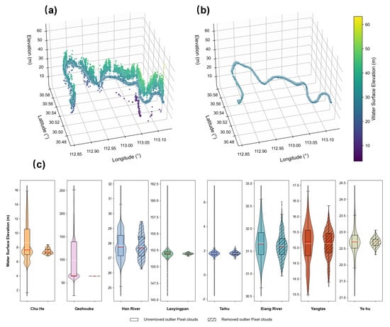 The pixel cloud is composed of a collection of spatially discrete pixels, with significant variation in spatial density and uneven distribution. To address this characteristic, this study employs the ASOR method (Equation (6)), which analyzes the local spatial statistical properties of the pixel cloud and adaptively adjusts the neighborhood scale to effectively identify and remove outliers. This process significantly improves the precision and reliability of the filtering. After removing the noise values, a 600 m wide range was selected for the pixel cloud, and the WSE value for each pixel cloud was obtained by averaging within this range.