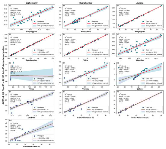 (a–m) Correlation analysis between quality-screened water levels derived from L2_HR_RiverSP or L2_HR_LakeSP products and in situ measured water levels.