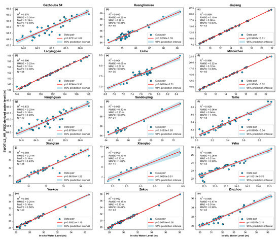 (a–o) Correlation analysis between water levels derived from the L2_HR_PIXC product and in situ measured water levels.