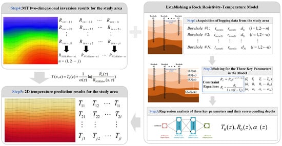 Step 5: Based on the , , and obtained in Step 3 and the normalized apparent resistivity obtained in Step 4, the predicted temperature at each node is determined by substituting the above values into Equation (1), and finally, the distribution of the subsurface temperature field in the study area is obtained.